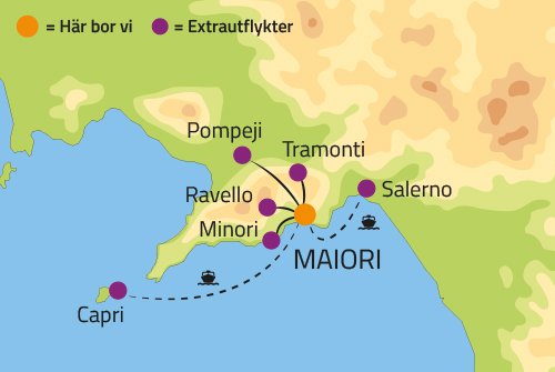 Notera att dagsprogrammets innehåll tar utgångspunkt i att samtliga utflykter köpts till separat, undantaget stadsvandringen i Maiori som ingår i resans pris.