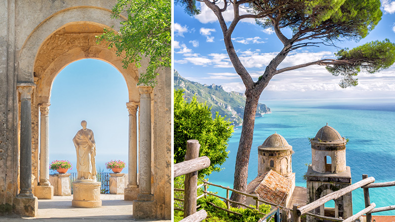 Framme i centrala Ravellos finns det gott om möjlighet att trivas. Den ståtliga domkyrkoplatsen framför Santa Maria Assunta dryper av lokal charm, och trots att kyrkan är stängd under eftermiddagen finns det möjlighet att besöka kyrkomuseet. Från stadens centrala torg har du tid att på egen hand att bekanta dig med staden och besöka några av de fantastiska villorna Villa Rufolo och Villa Cimbrone, där den senare av de bägge är berömd för att husera Amalfikustens vackraste utsikt.
